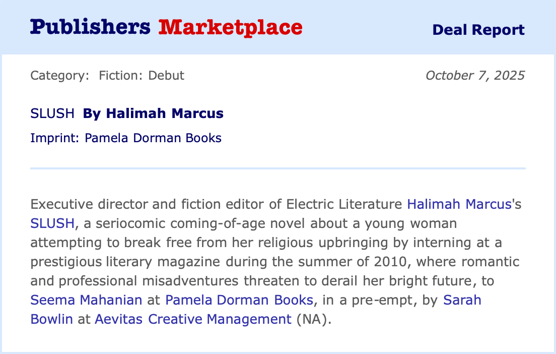 Her debut novel, SLUSH, is forthcoming from Pamela Dorman Books in 2027.